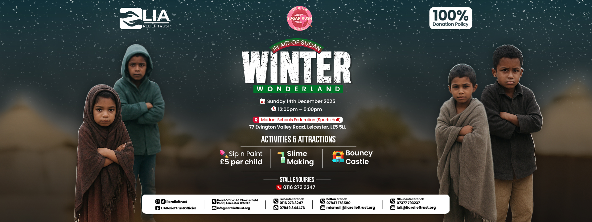 On Sunday 14th December 2025, from 10am to 5pm, come along to Madani Schools Federation (Sports Hall) for a magical Winter Wonderland in aid of Sudan! Enjoy a fun-filled day with activities including Sip ’n’ Paint, a slime making workshop and a bouncy castle.
